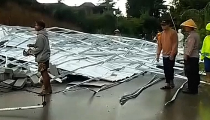 Video amatir warga merekam detik-detik pascakejadian saat Jalan Cilegon–Mancak tertutup atap dapur rumah milik MBG yang terbang akibat angin kencang. Material rangka baja ringan tampak melintang di tengah badan jalan, sehingga kendaraan tidak dapat melintas.