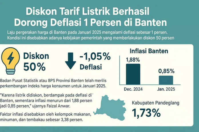 Serang, bantentv.com – Laju pergerakan harga di Banten pada Januari 2025 mengalami deflasi sebesar 1 persen. Kondisi ini disebabkan adanya kebijakan pemerintah yang memberlakukan diskon 50 persen pada listrik.