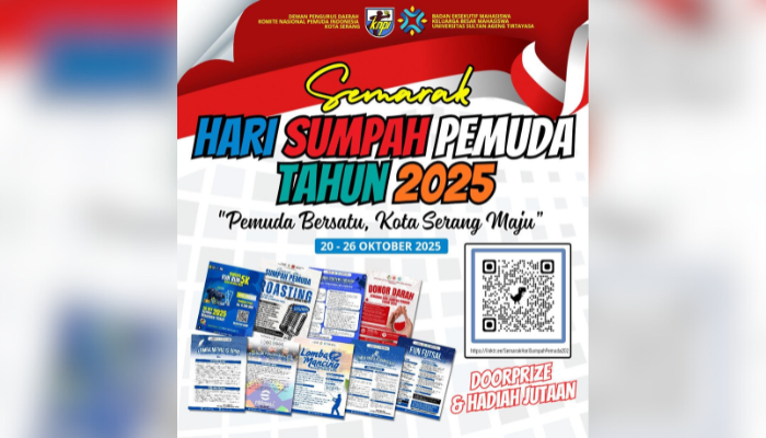 Serang, Bantentv.com – DPD KNPI Kota Serang bersama Badan Eksekutif Mahasiswa (BEM) Universitas Sultan Ageng Tirtayasa (Untirta) bakal menggelar acara bertajuk “Pemuda Bersatu, Kota Serang,” yang berlangsung selama 7 hari. Terhitung dari 20 hingga 26 Oktober 2025 yang dipusatkan di Stadion Maulana Yusuf Ciceri, Kota Serang.
