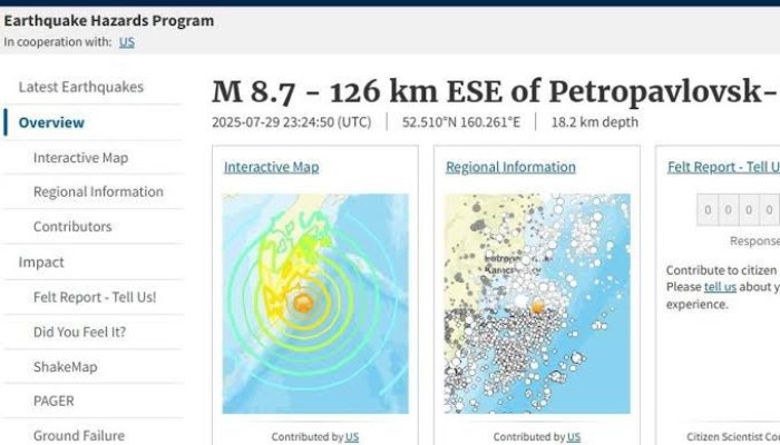 Bantentv.com – Gempa bumi yang terjadi pada Rabu, 30 Juli 2025 di lepas pantai timur Rusia berkekuatan magnitudo 8,6 itu picu peringatan tsunami di Samudera Pasifik.