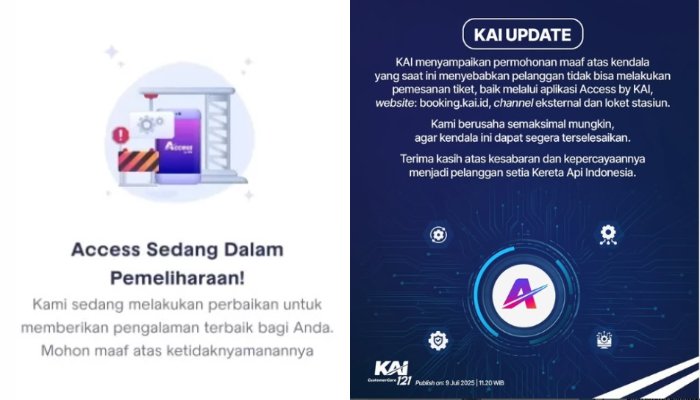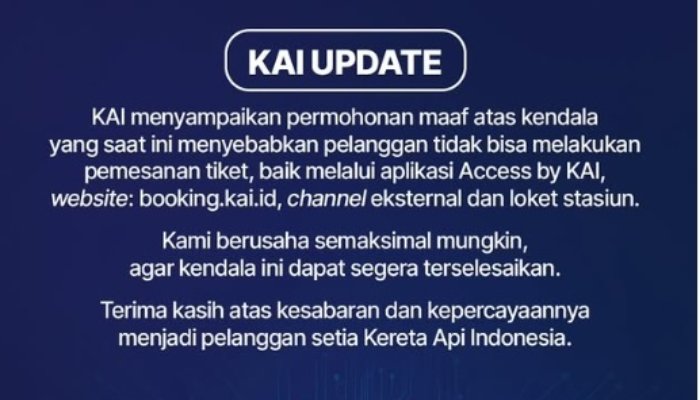 “KAI menyampaikan permohinan maaf atas kendala yang saat ini menyebabkan pelanggan tidak bisa melakukan pemesanan tiket, baik melalui aplikasi Access by KAI, website : booking.kai.id, channel eksternal dan loket stasiun,” tulis KAI pada unggahannya tersebut.