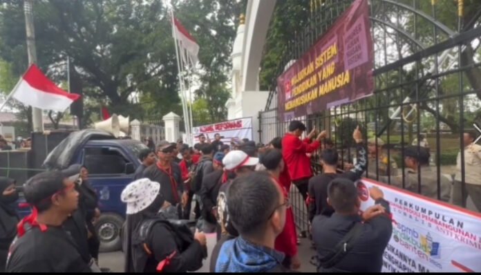 Serang, Bantentv.com – Massa gabungan para guru dan mahasiswa menggelar aksi di Depan Rumah Dinas Gubernur Banten di Gedung Negara Kota Serang Kamis pagi, 3 Juli 2025.