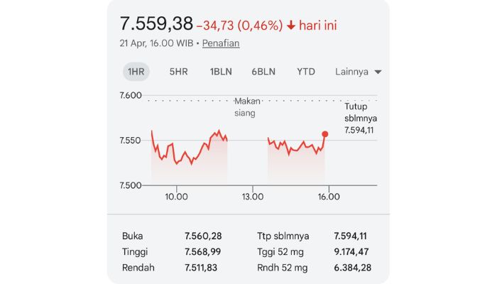 Bantentv.com – Indeks harga saham gabungan (IHSG) kembali ditutup melemah ke 0,46 persen atau 34,73 poin ke level 7.559,38 pada perdagangan hari ini, Selasa 21 April 2026.
