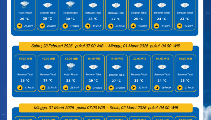 Bantentv.com – Warga Kota Serang diimbau tetap waspada terhadap perubahan cuaca pada Sabtu, 28 Februari 2026. Berdasarkan prakiraan, cuaca di wilayah ini didominasi berawan tebal sejak dini hari hingga malam, dengan potensi hujan ringan pada siang hari.