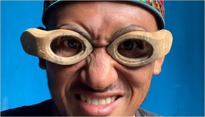 Kacamata ini berbahan dasar dari kayu yang kemudian dibentuk dan dirancang sedemikian rupa sehingga memiliki fungsi melindungi mata saat menyelam.
