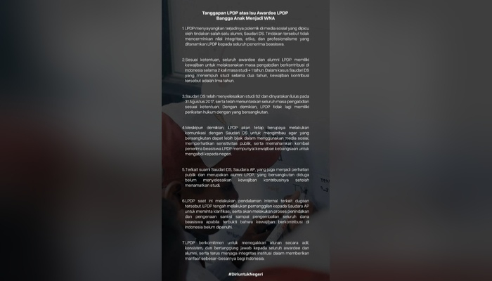 Lembaga tersebut menilai pernyataan DS tidak mencerminkan nilai integritas, etika, dan profesionalisme yang ditanamkan kepada para penerima beasiswa.